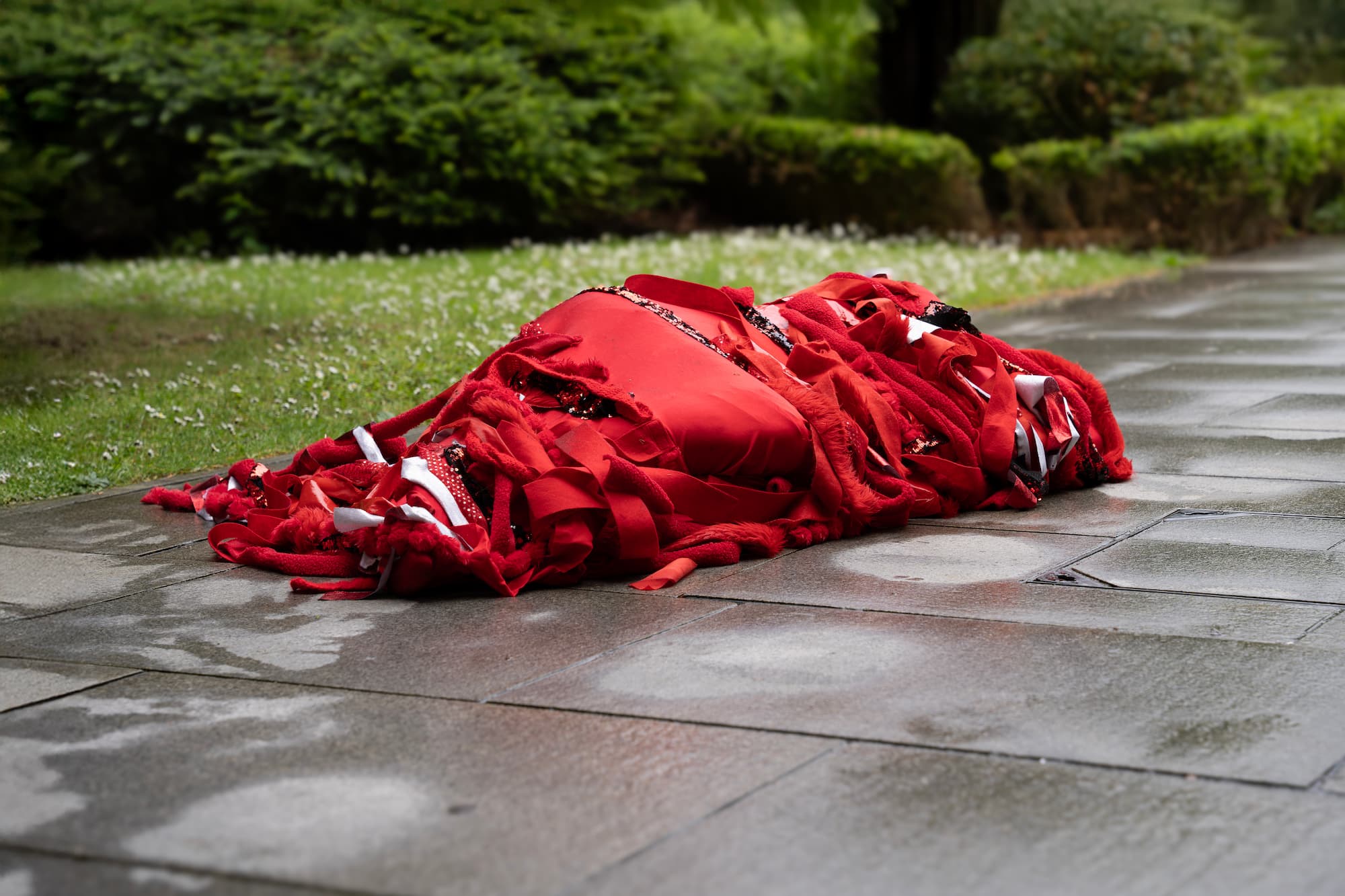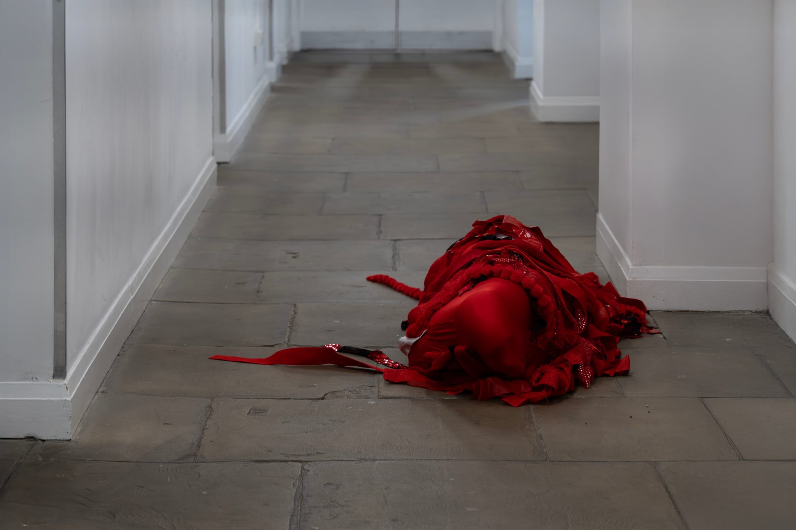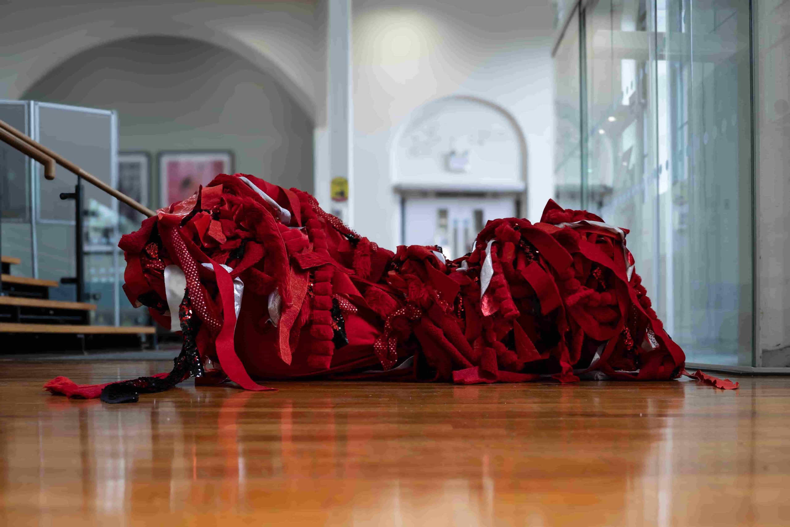 Over five days, the artist slowly moved across the university grounds, queering time and space through embodied neurodivergent movement. Wearing a red body sock adapted with removable red fabric strips, the artist gradually became entangled with the institution’s physical and symbolic architecture. The pace of this work was deliberately slow, attuned to a crip temporality, a refusal of urgency, productivity, and institutional efficiency. As the artist moves, red fabric strips were left behind, as residue, as trace, as quiet disruption. These fragments mark encounters between body and institution, forming a dispersed, tentacular network across the campus. This was not a linear or goal-oriented journey, but a fugitive one, drifting through and against the grain of academic space.