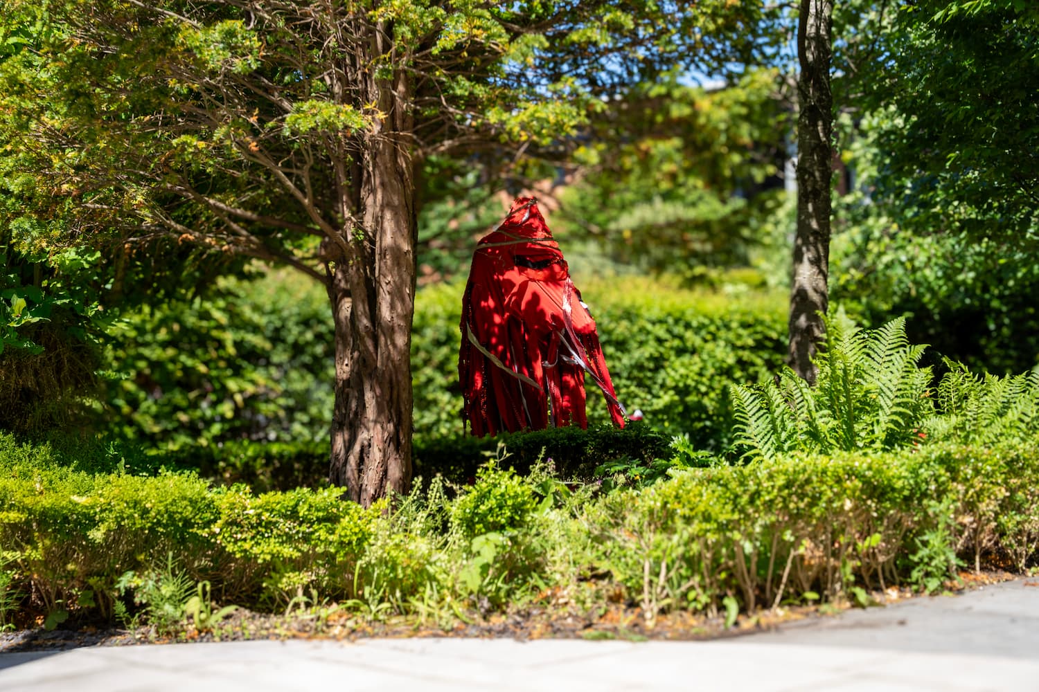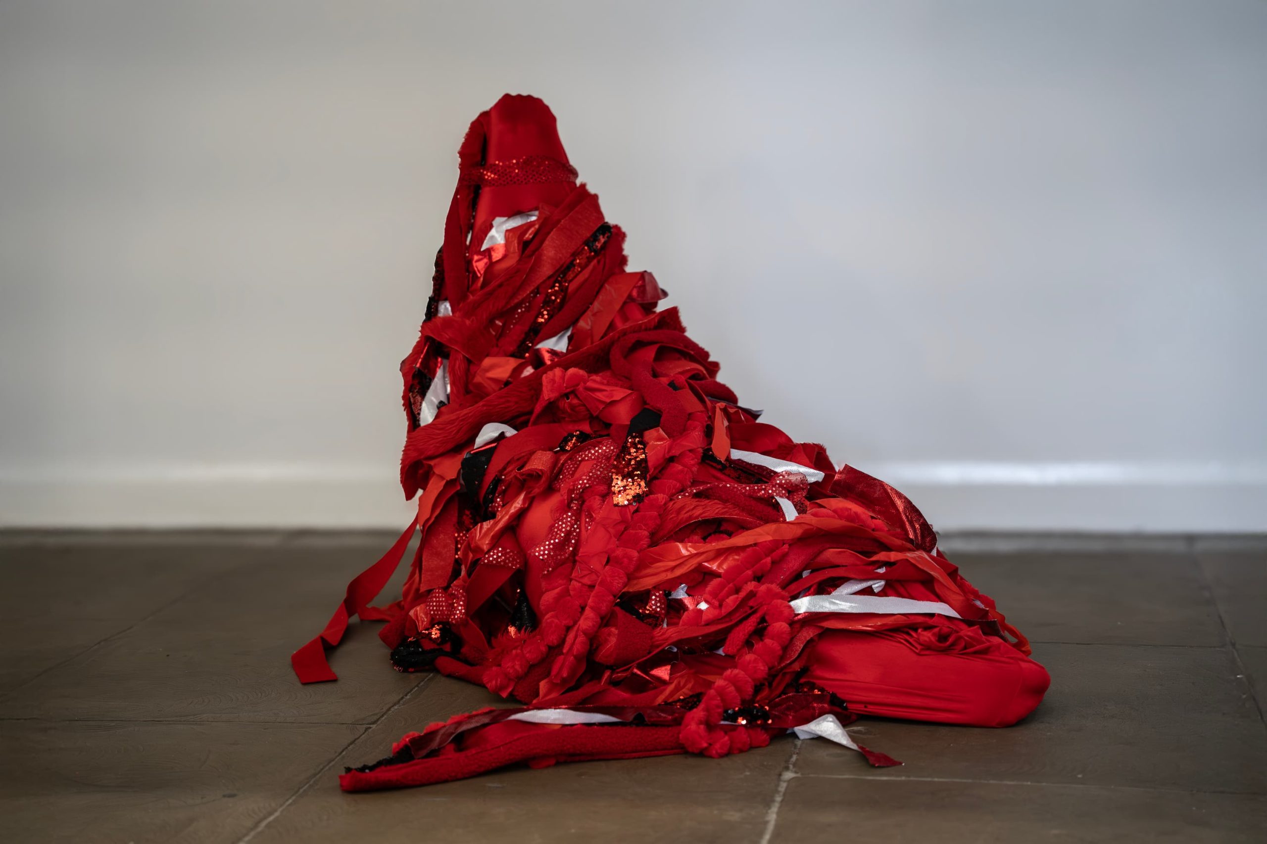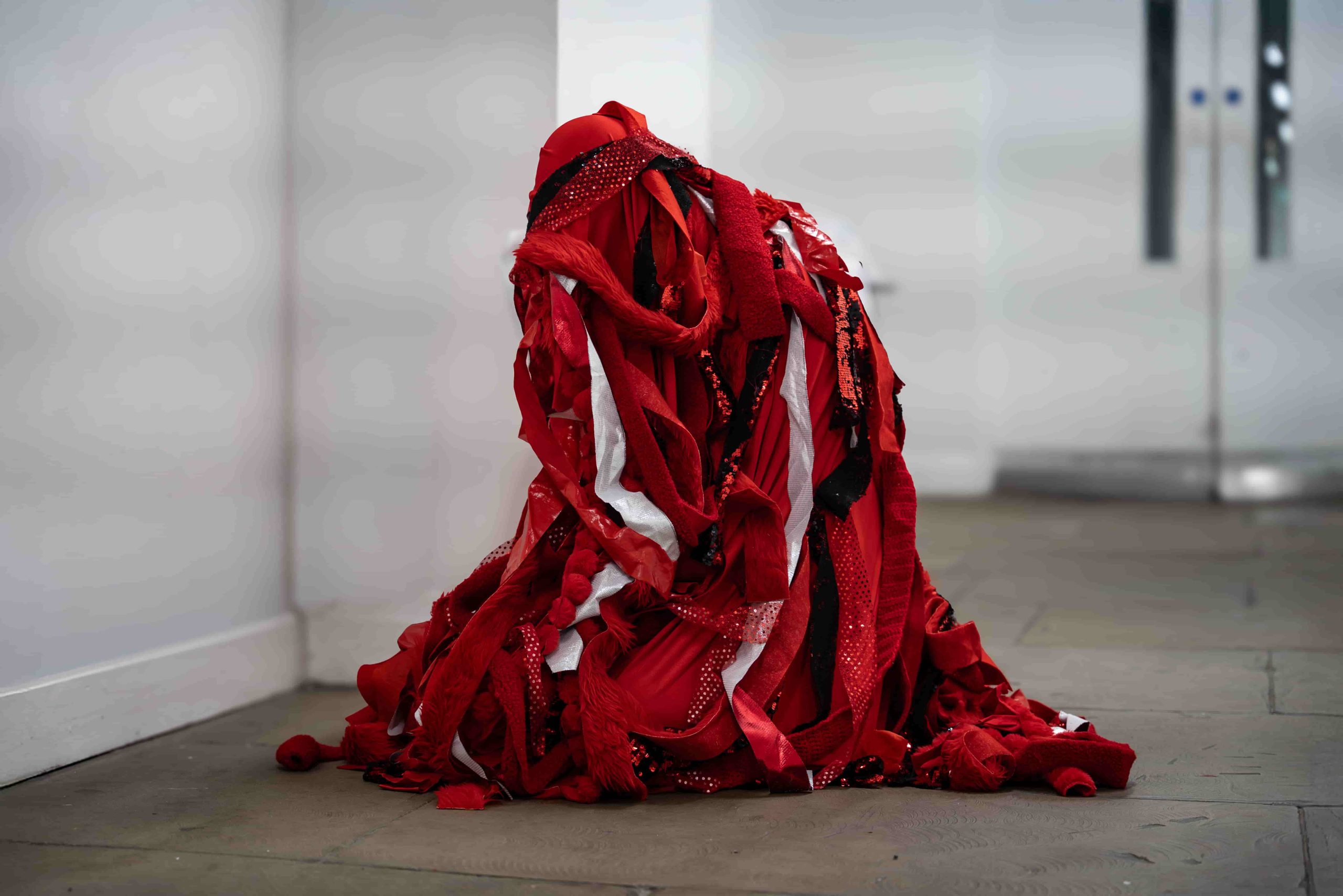 Over five days, the artist slowly moved across the university grounds, queering time and space through embodied neurodivergent movement. Wearing a red body sock adapted with removable red fabric strips, the artist gradually became entangled with the institution’s physical and symbolic architecture. The pace of this work was deliberately slow, attuned to a crip temporality, a refusal of urgency, productivity, and institutional efficiency. As the artist moves, red fabric strips were left behind, as residue, as trace, as quiet disruption. These fragments mark encounters between body and institution, forming a dispersed, tentacular network across the campus. This was not a linear or goal-oriented journey, but a fugitive one, drifting through and against the grain of academic space.